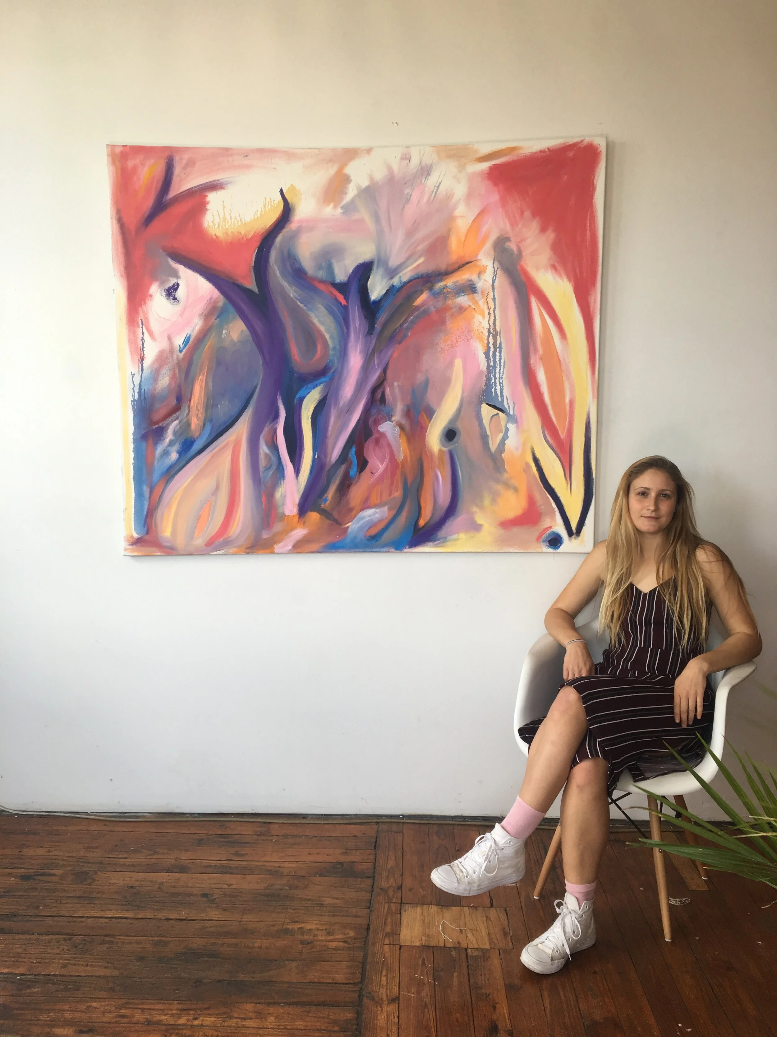 I created a large canvas before my Greenpoint Open Studios Art show in NYC. My roommate come in looking at all my work and criticizing it. He was a architecture student and didn’t understand my dreams and structure-less work. It hit me hard. My vulnerability, my questioning of what is ‘good art,’ patriarchal authority, and my emotional fears of it not being good enough. My frustration of sexual expression. As a result I took it our on a canvas, letting the feminine fits within burst through like flames. My resistance to the frustration within me. I let it out. I broke free.